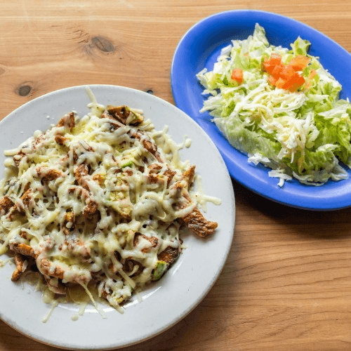 Grilled steak, onions, bell peppers, mushrooms, and bacon topped with melted cheese and served with Mexican salad and tortillas