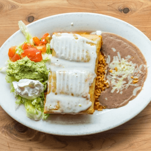 Tortillas stuffed with beef or chicken, fried and topped with melted cheese. Served with rice, beans, lettuce, tomatoes, guacamole and sour cream